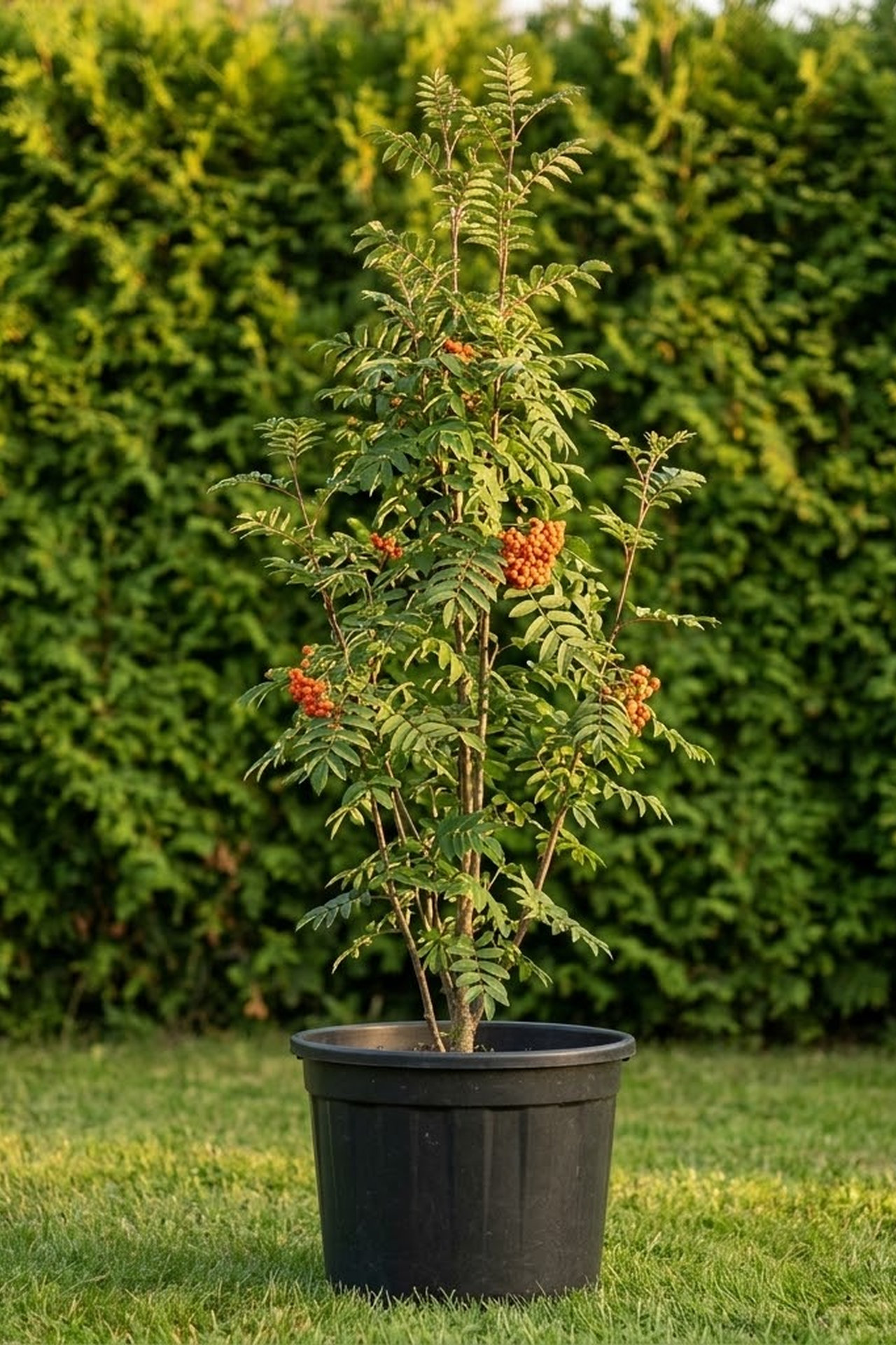 Небольшое дерево, форма кроны строго колоновидная, после 15-20 лет становится более яйцевидной и ассиметричной; медленнорастущее. Высота 5-7 м, ширина 2-4 м. Листья крупные, черешковые, непарноперистые, с 9-15 овальными, по краям зубчатыми листочками; темно-зеленые, осенью почти не меняют цвет или становятся слегка желтоватыми. Плоды кораллово-красные, шаровидные, долго сохраняются на ветвях. Зимостойка, предпочитает прохладные, влажные места, ветроустойчива.