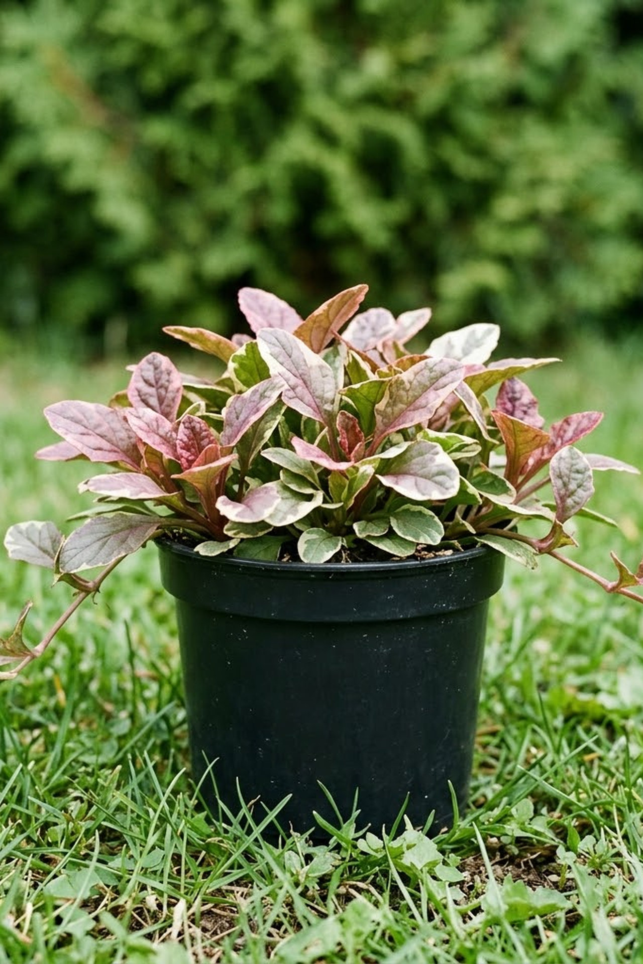Почвопокровное растние, высотой до 10 см, листья имеют разную окраску: от зёлой с розовой каймой, до красной с белой каймой. Листья зимующие. Цветы синие. Неприхотливое растние, более пышное в условиях полутени. Зимостойкое.