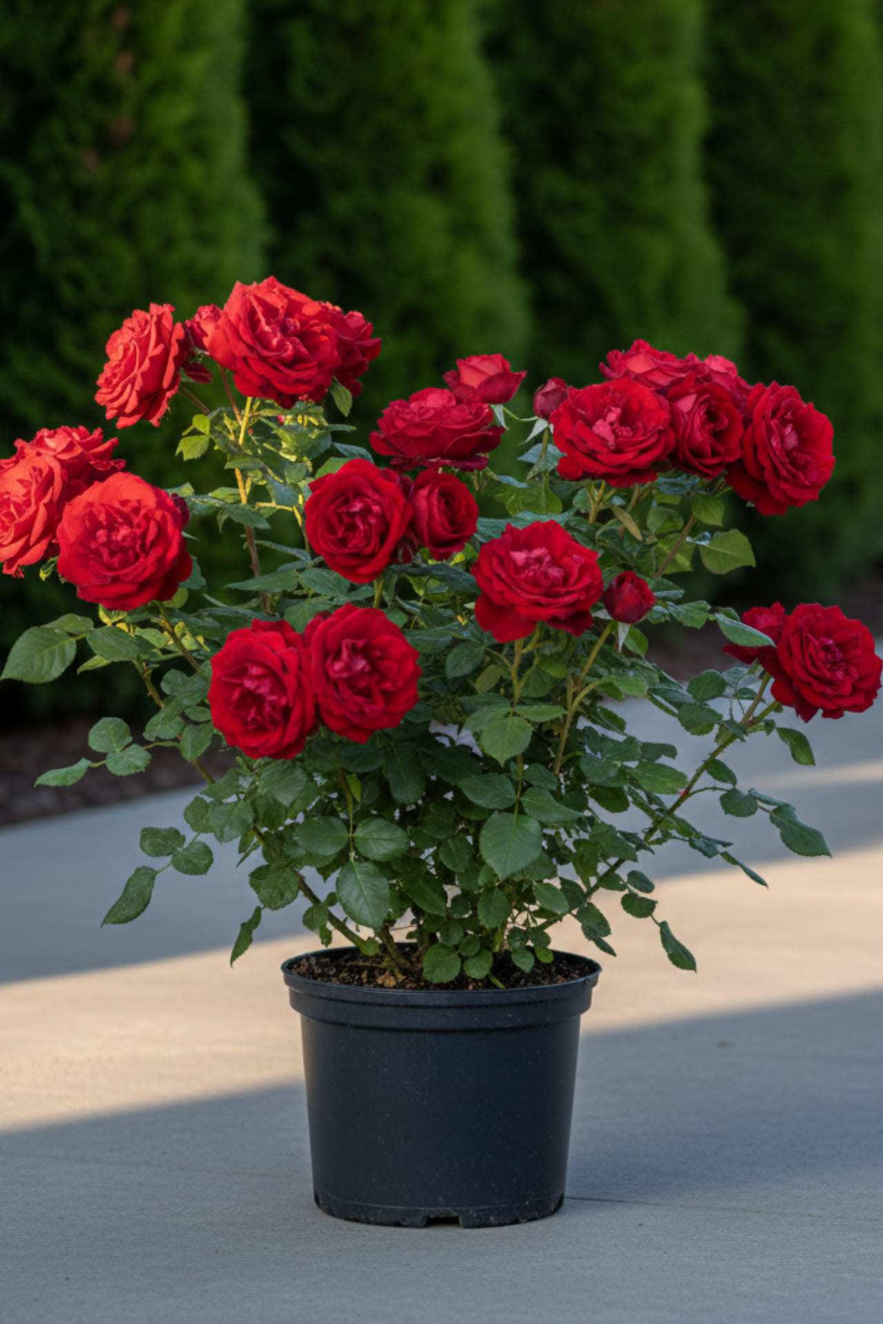 - темно-красного цвета, махровая 80-82 лепестка. На ветке 3-5 цветков с нежным ароматом. Листва на кусте мелкая, плотная, глянцевая.